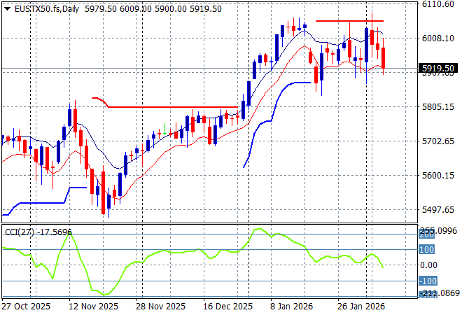 European markets can’t rely on a falling Euro with more selling overnight with the Eurostoxx 50 Index closed nearly 0.8% lower at 5925 points, still unable to reach its former highs.