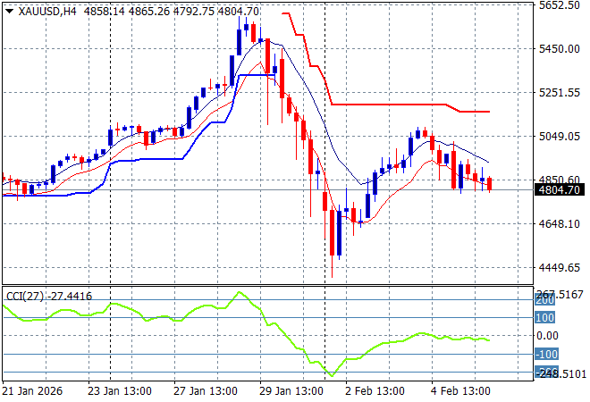 Gold is failing to get back on track after a near $1000USD per ounce drop as it remains well below the $5000 level with a continued retracement overnight.