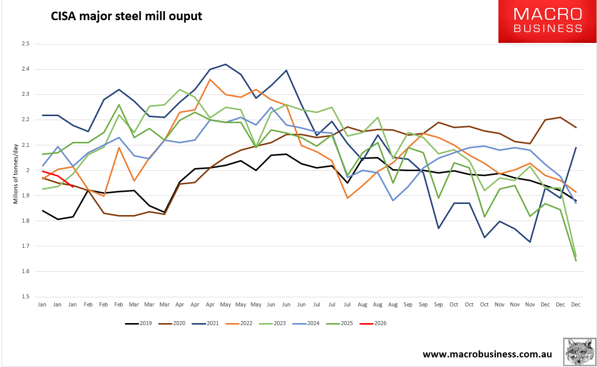 That is, if steel prices don’t start falling again. And they well might. CISA output for the last ten days of January was poor.
