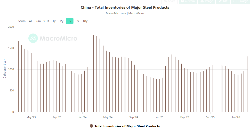 China’s total steel inventory is a little below last year.