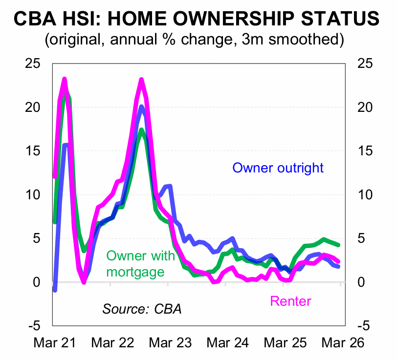 Compared to renters (1.6%) and outright homeowners (0.8%), mortgage holders continued to report the highest yearly spending growth (4.0%).