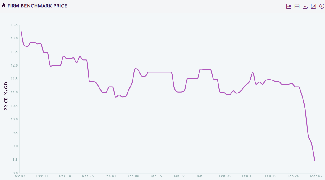 Locally, gas prices are falling, apparently owing to unusually weak NEM demand.