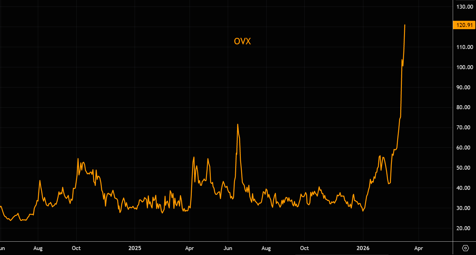 Charts from TME. Oil volatility is still climbing and pricing well above spot.