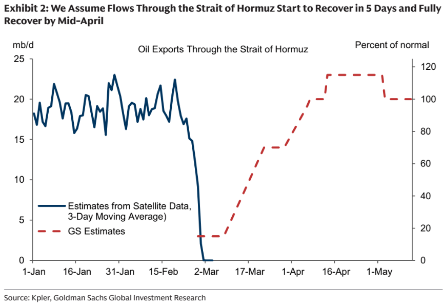 It makes the “extremely speculative assumption” that oil shipments from the Strait of Hormuz would stay flat at their current levels (about 15% of average 1) for five more days before progressively increasing to 70% over the next two weeks and then to 100% over the next two weeks.