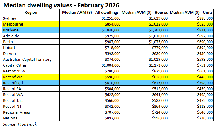 As of February 28, 2026, Regional Queensland’s median dwelling value of $810,000 was $214,000 (36%) higher than Regional Victoria’s median dwelling value.