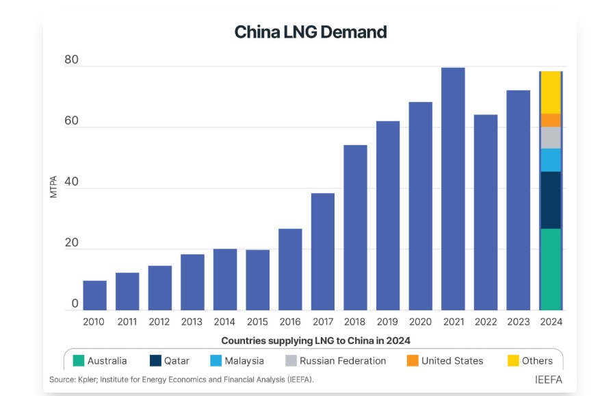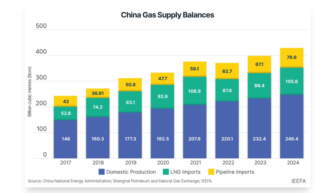 A different IEEFA report from about a year ago highlights both the sources of Chinese LNG imports as well as the role LNG plays in relation to piped exports and growing Chinese gas production. Three good charts tell us all we need to know.
