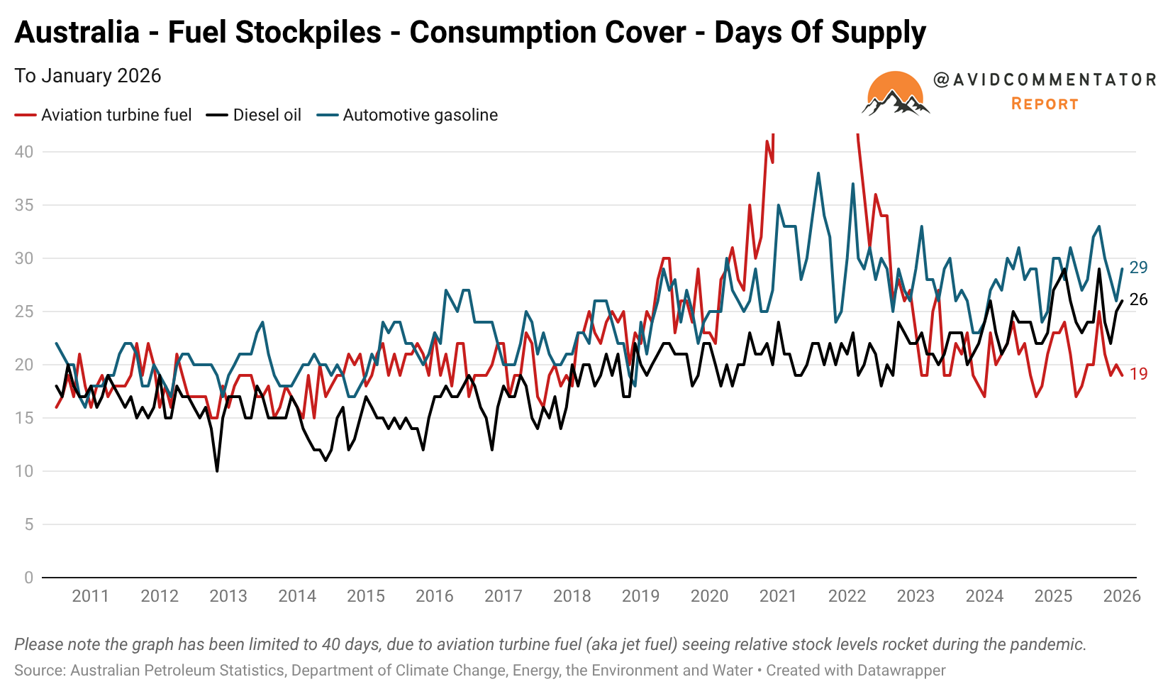 As part of his push, he cited data from the Department of Environment and Energy, which estimated that, at the time, Australia had 19 days’ worth of petrol, 23 days’ worth of jet fuel, and 22 days’ worth of diesel.