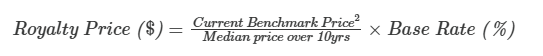 The formula would take the ratio of the current benchmark price, or the current price received by a firm with longer-term contracts, and the median market price over a long period, such as 10 years. Then it would apply this scaling factor to a base royalty rate.