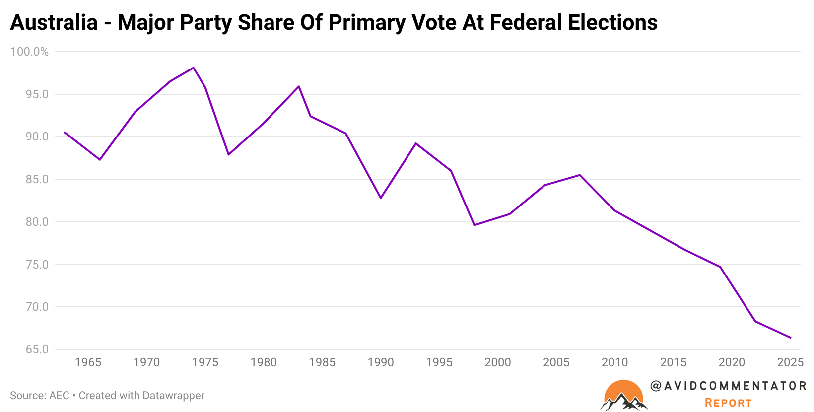Despite fluctuations in their combined force in federal politics, as indicated by their share of the primary vote, the trend has been consistently downward since the last high point in 2007 (85.5%).