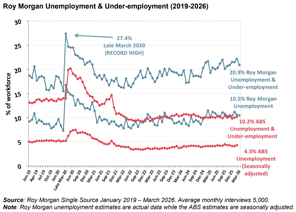 In March 2026, Australian ‘real’ unemployment dropped 28,000 to 1,693,000 (10.5% of the workforce, down 0.1%), and under-employment dropped 205,000 to 1,687,000 (down 1.2% to 10.4%).