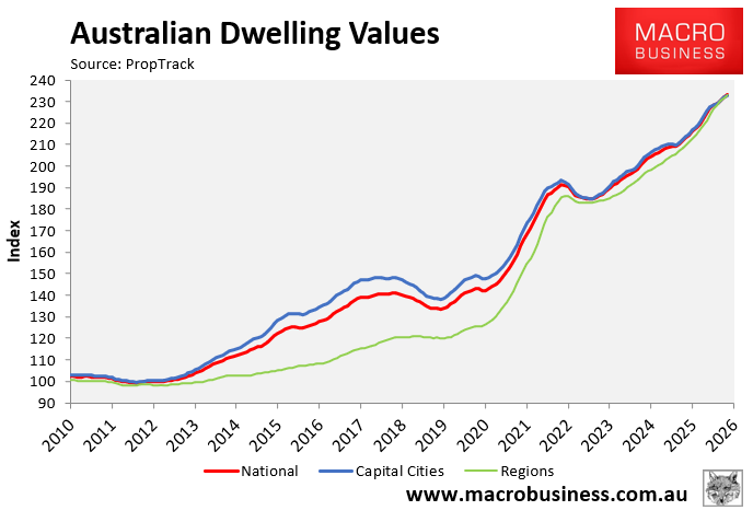 The Australian Bureau of Statistics (ABS) also valued the average dwelling at a record $1,074,000 as of the December quarter of 2025, up from $687,000 as of the December quarter of 2019.