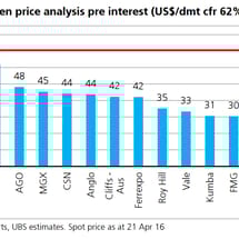 Just kidding, both are sells. But right now the relative valuation differentials are stark, from UBS comes their weekly estimate of the earnings outlook versus current spot prices: All else equal, our BHP & RIO earnings estimates for CY16E would be 97,815% (very low base) and 150% higher respectively, under a spot scenario.