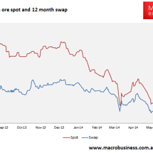 Here are the iron ore charts for May 15, 2014: Paper markets are weak or weaker with 12 month swaps struggling to get above $100, Dalian 6 month hanging at record lows and, most importantly for the future, rebar futures plumbing record depths daily.